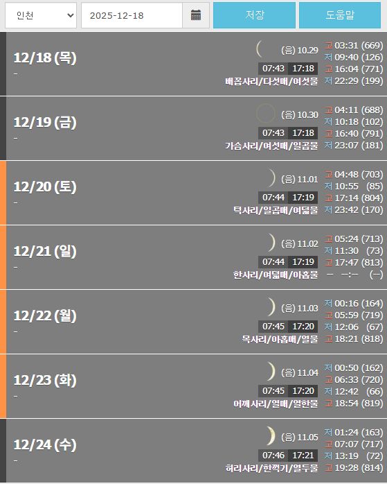 - 조금: 조수간만의 차이가 작고 물살이 약한 날입니다.
