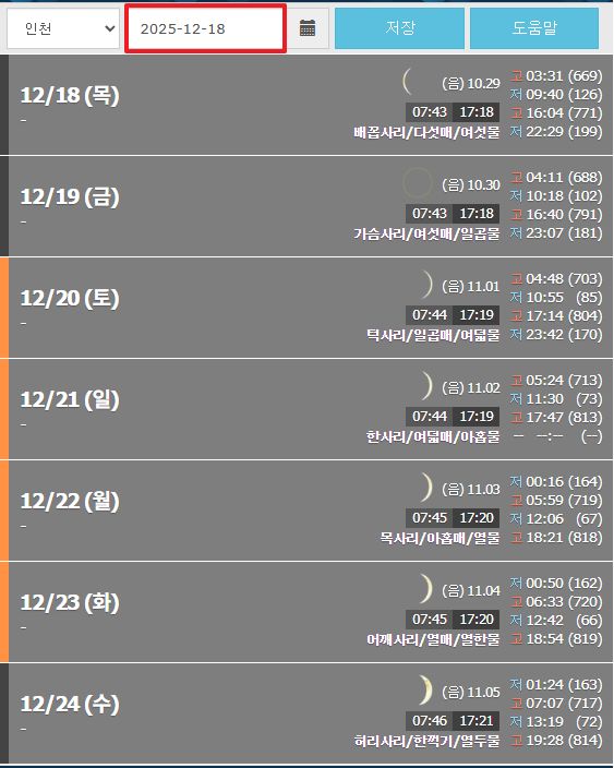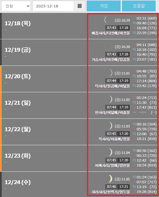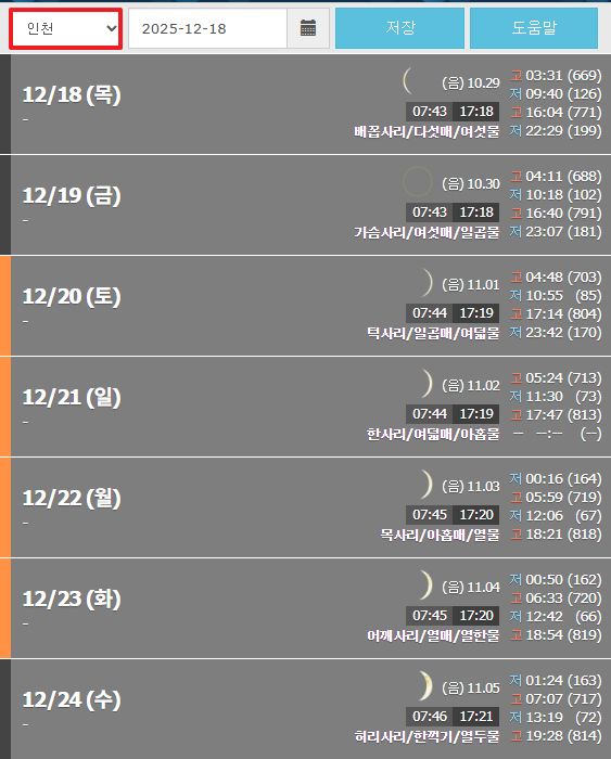 그러면 원하는 장소와 날짜를 선택하시고 바다 물때표를 보시면 됩니다.